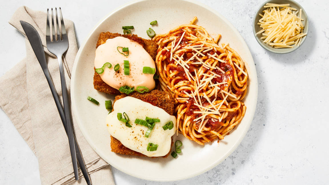 Бұл вегетариандық бағыттағы ескі мектептің классикалық итало-американдық тағамы! Қытырлақ панировкадағы тофу маринара соусымен жағылып, үстіне моцарелла себіледі, ол тамаша еріп, созылмалы болады. Оған ащы маринара соусы мен пармезан қосылған спагетти беріледі. Көңіл-күйді көтеру үшін сізге қызыл торлы дастархан қажет!