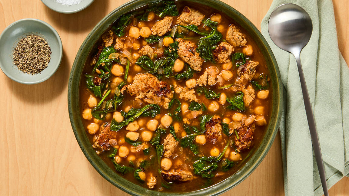 Независимо от погоды, всегда хочется съесть большую тарелку супа (кулинарный эквивалент медвежьих объятий). Этот сытный и согревающий суп — то, что нужно. Он полон вкусностей: пряные куриные колбаски, нежный нут, шпинат и множество итальянских трав в насыщенном томатном бульоне. Суп готов!